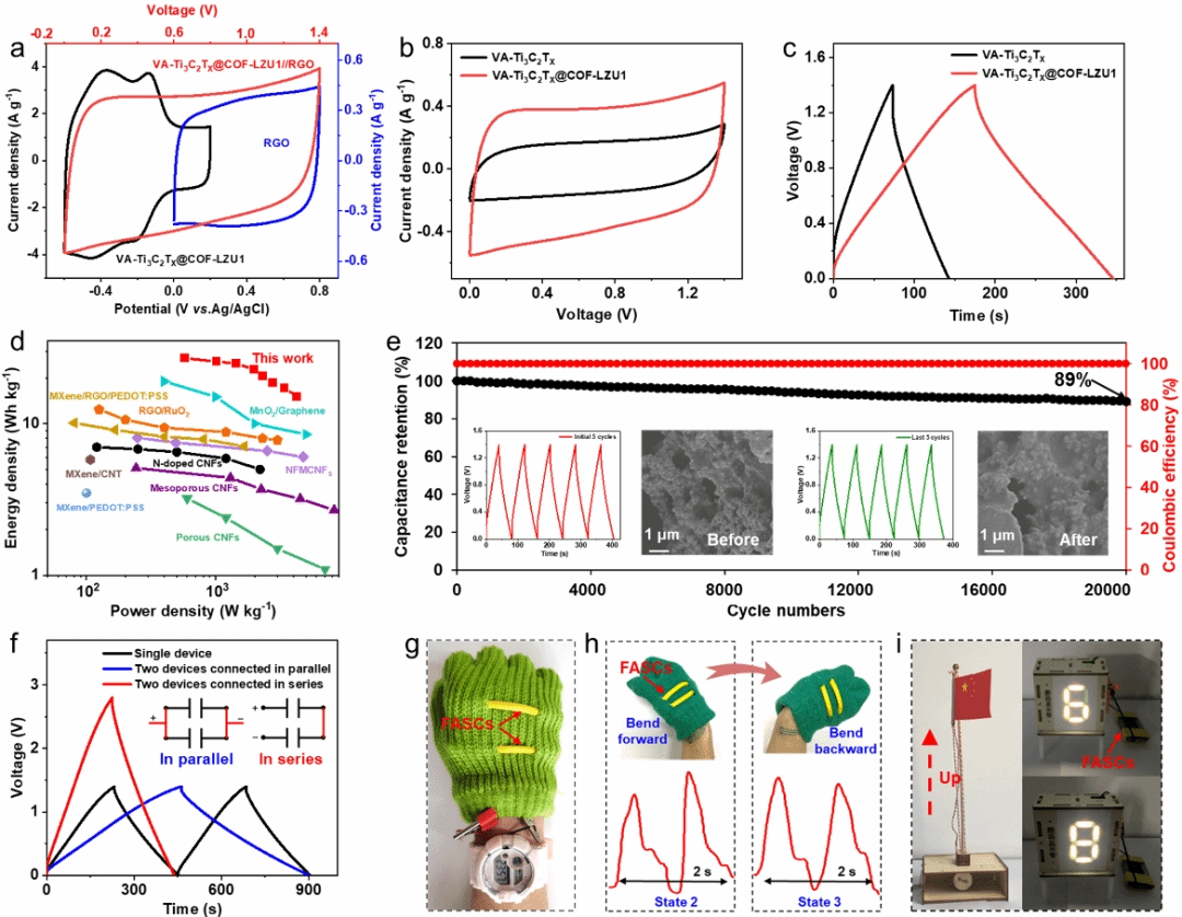 ❖ 固态纤维状超级电容器的构筑与可穿戴应用。进一步将VA-Ti3C2Tx@COF-LZU1复合纤维组装成全固态非对称型纤维状超级电容器器件 (FASCs),其呈现出良好的比电容 (398 F g-1)、高能量密度 (27 Wh kg-1)和长循环稳定性。将FASCs进行串并联,实现了电压或电流的成倍提升,满足了实际应用中设备对高工作电压和容量的需求;将封装后的FASCs集成到织物中,能够稳定地为手表、显示器、电动马达等供电;将FASCs与传感器集成,设计出可穿戴能源-传感器件,该器件可实时稳定地监测人体脉搏等生理信号。