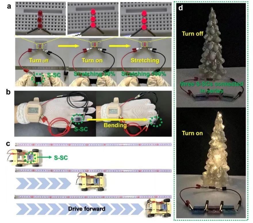 ❖得益于以上优异的力学和电化学性能,固态S-SCs实现了为LEDs、手表、电风扇和玩具车的稳定供电应用。最重要的是,S-SCs成功获得了在100%应变的条件下为LEDs稳定供电,以及在弯曲变形下为手表提供能量,为未来纤维能源的产业化与智能穿戴供电应用提供了技术参考。