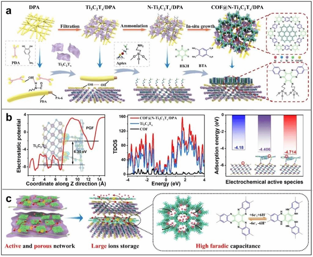 图1. COF@N-Ti3C2Tx/DPA柔性电极的设计与储能机理。