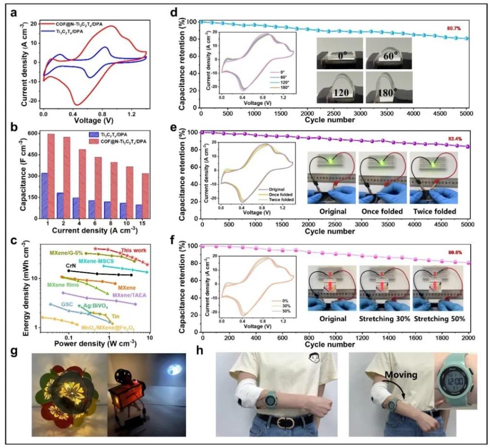 ❖ 离心静电纺丝制备的尼龙6纳米纤维膜提供了强健的机械性能,使电极材料具有优异的形变能力。多孔的网络结构、丰富的法拉第活性位点和高的电导率赋予了COF@N-Ti3C2Tx/DPA电极材料较大的界面电荷转移、良好的离子扩散动力学和显著的法拉第电容。在三电极体系下,COF@N-Ti3C2Tx/DPA电极呈现出高体积比电容 (1298.3 F cm-3 at 1 A cm-3)、优异的倍率性能 (847.3 F cm-3 at 20 A cm-3) 和良好的循环性能 (20000 cycles)。