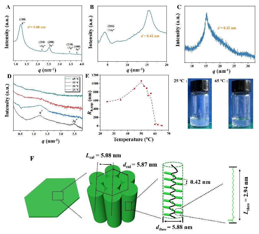 小角X射线散射(SAXS)实验进一步证实了该片状结构呈现高度对称的六方柱状相结构,而广角X射线衍射实验测得烷基侧链之间的侧部距离在0.42 nm,与SAED和HRTEM结构一致,表明该六边形片状胶束呈现出具有不同层次的有序结构(图3)。当胶束溶液加热到55 - 65 °C时,变温SAXS结果显示其散射峰变得弥散或完全消失,表明侧烷基链的堆积结构在高温下完全无序。动态光散射(DLS)分析显示,当溶液温度加热到55 ℃以上时,表观流体力学半径(Rh,app)急剧下降,表明侧链的相变导致了片状胶束的解体,也证明了二十二碳烷基侧链的优异结晶性能是驱动嵌段共聚物自组装成二维片状胶束的主要驱动力。