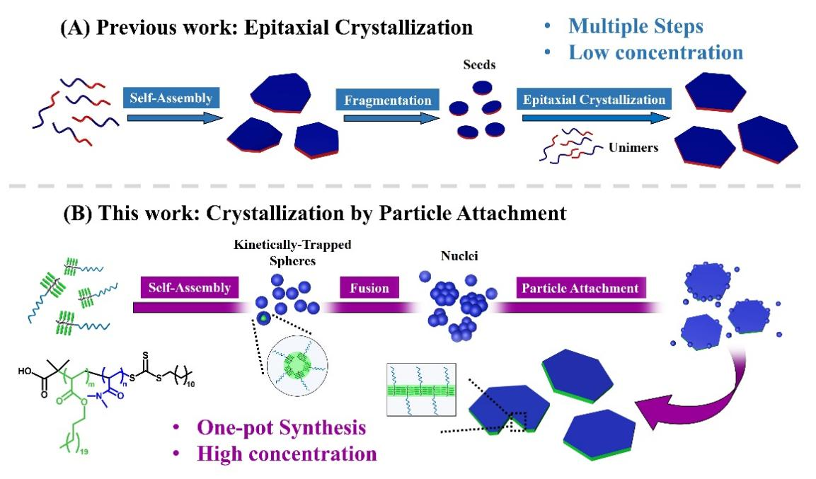 基于上述问题,童再再团队通过聚合物链段化学结构的设计,在聚合物侧链上引进具有可结晶的长链烷基如-C22H45,研究侧链可结晶的聚丙烯酸酯类嵌段共聚物的自组装,发现了一种新的结晶组装机制:“粒子附着结晶”(图1)。通过这种组装机制,可以实现一锅法宏量(≥ 6.0 wt%)制备均一且规则的二维六边形片状胶束。这种组装机制为设计可精确控制尺寸的软物质纳米材料提供了一种简便的策略。