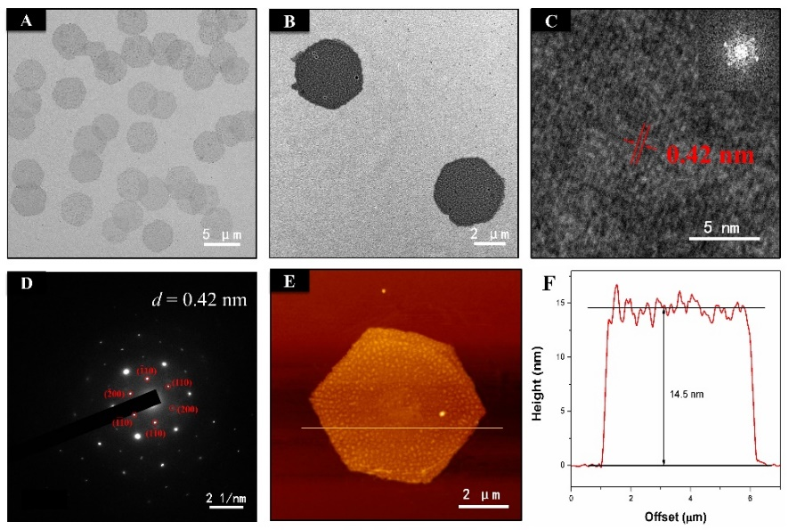 研究团队首先通过可逆加成断裂聚合方法制备了含侧链结晶的嵌段共聚物,聚丙烯酸二十二烷基酯-b-聚N,N-二甲基丙烯酰胺(PA22C-b-PDMA),并研究了其在甲醇中的自组装。将5 mg mL-1的嵌段共聚物甲醇溶液在65 ℃下加热3 h,然后冷却到室温(25 ℃)并老化3天后进行形态学成像以及结构表征(图2)。通过透射电子显微镜(TEM)、冷冻透射电子显微镜(Cryo-TEM)和原子力显微镜(AFM)观察到在甲醇中形成了结构均一的二维六边形片状胶束。同时作者通过高倍透射电子显微镜(HRTEM)和选区电子衍射(SAED)证实了该六边形片状胶束具有良好的结晶性。