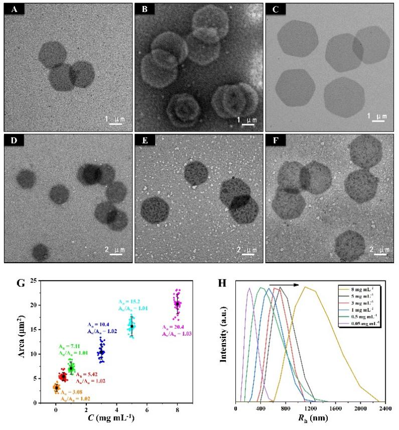 图5. 通过改变自组装浓度实现二维六边形片状胶束的尺寸调控