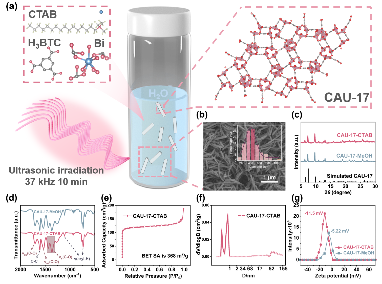 图1. 表面活性剂介导的水溶液中一步合成CAU-17的合成示意图和形貌结构表征