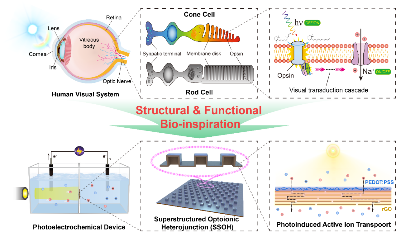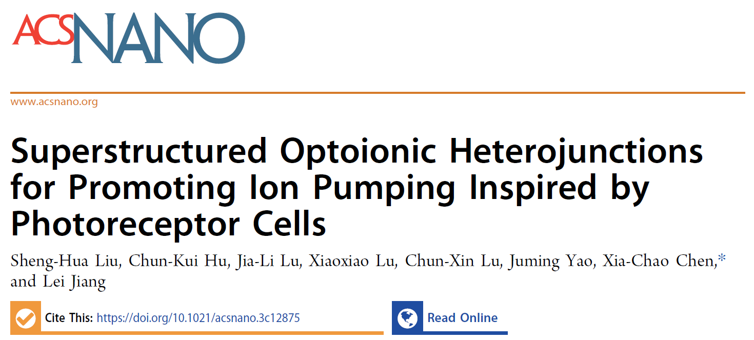 青年教师陈夏超副研究员在光驱动离子传输领域取得最近进展,通过借鉴脊椎动物视细胞的超微折叠膜形态,设计出一种超结构光驱动离子传输异质结。相比于传统的平面异质结,这种超结构异质结具有更优异的光驱动离子传输性能,有望为下一代高性能离电感光器件提供了核心部件。相关工作以《Superstructured Optoionic Heterojunctions for Promoting Ion Pumping Inspired by Photoreceptor Cells》为题发表在国际纳米科学高水平期刊《ACS Nano》上,陈夏超副研究员为唯一通讯作者。