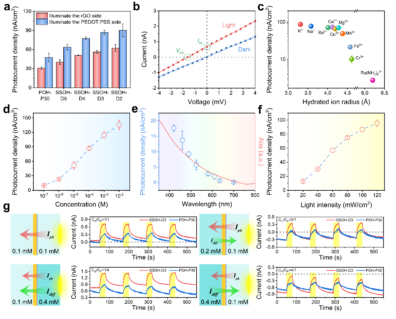 图2. 超结构异质结光驱动离子传输性能