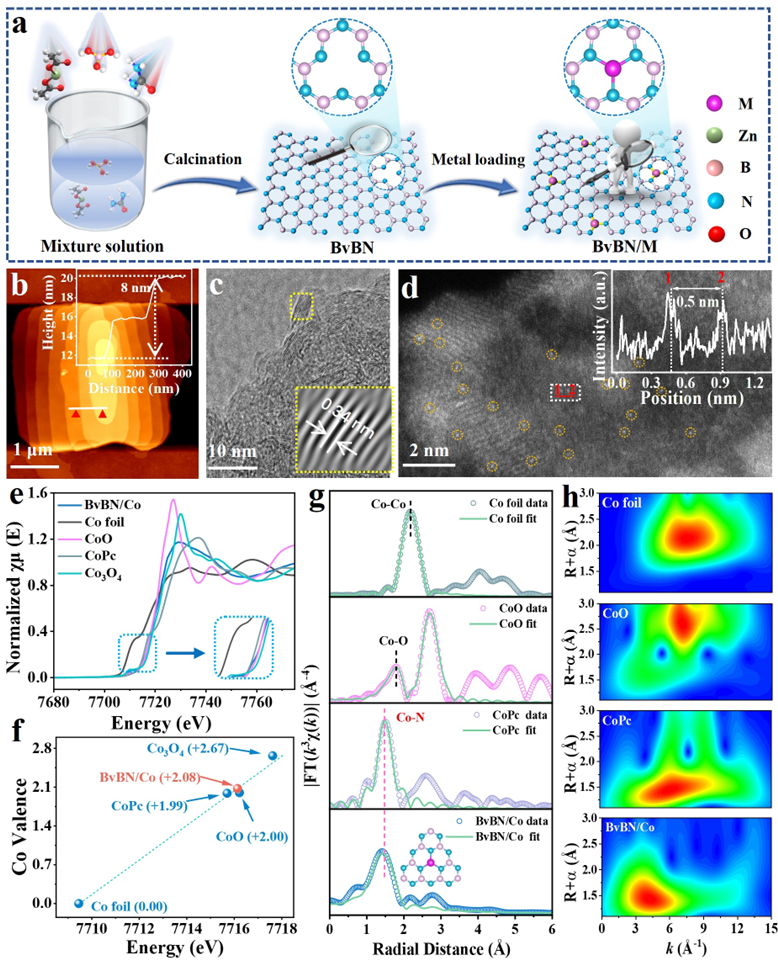 基于理论计算结果,作者通过空位调控和金属锚定策略合成了系列具有金属单原子分散的BvBN/M催化剂。为了验证BvBN/M催化剂活化PMS选择性生成1O2的性能,作者以双酚A(BPA)为探针污染物,通过淬灭实验、探针实验以及EPR分析验证BvBN/M-PMS体系中存在的ROS。
