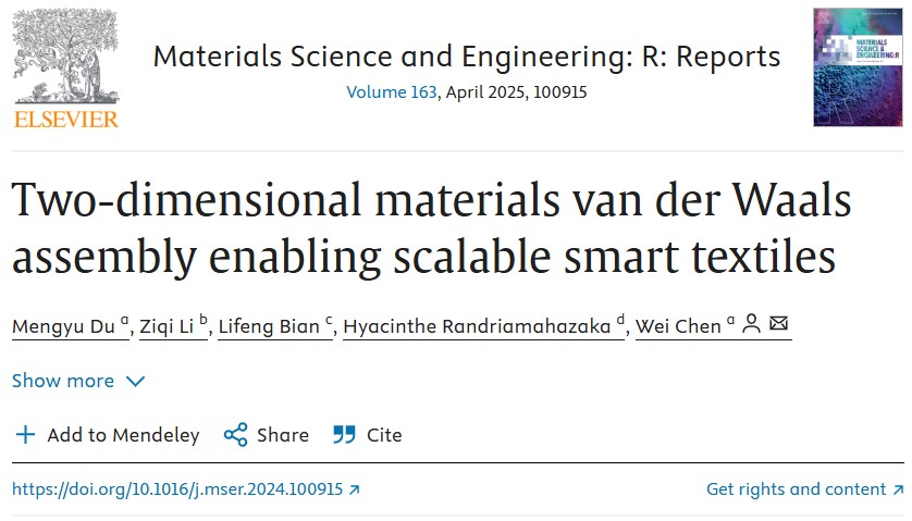 陈韦教授团队在《Materials Science and Engineering: R: Reports》上发表了题为“Two-dimensional materials van der Waals assembly enabling scalable smart textiles”的综述文章,这项工作总结了近5年来规模化vdW智能纺织品的研究取得显著进展,涵盖了2D功能材料、组装机制、制备与集成技术,并在医疗保健、人机交互等得多个领域应用(图1)。重点分析了规模化生产的技术问题,并针对性能、稳定性等挑战和未来研究方向提出相应关注和进一步发展的关键问题,为vdW智能纺织品与互联网融合及商业应用提供了重要指导,助力实现万物互联的智慧生活。