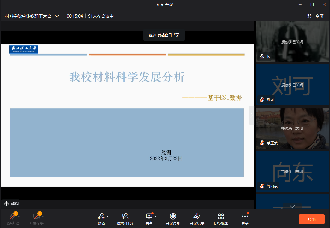 材料科学发展分析——基于ESI数据》报告,经老师从材料科学学科发展概况、发展对标、发展建议等三个方面展开分析,从材料学科历年论文发表数据、被引频次等数据为切入点,最后从吸引论文引用、增加学科论文、集聚研究人才、建设学术团队以及协调学科资源等五个方面为材料学科发展提出一系列建设性的发展建议。