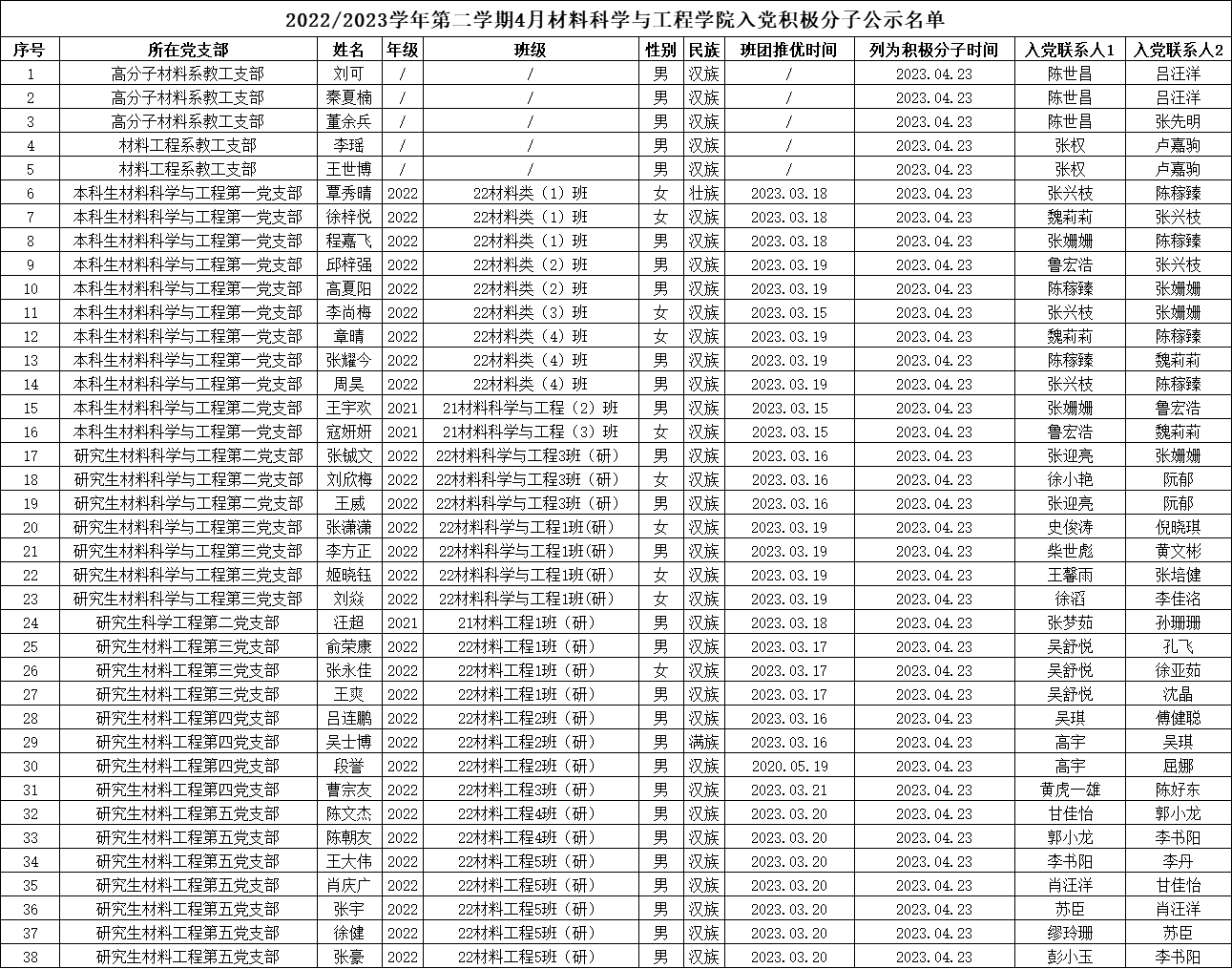党建动态 当前位置: 厂长资源 > 党建思政 > 党建动态 > 正文 厂长资源 2023年4月入党积极分子名单公示 作者:时间:2023-04-23浏览次数: 各党支部、团支部: 经各团支部“推优”、厂长资源 团委审核以及各党支部委员会讨论研究决定,确定刘可等38位同志为入党积极分子,现将名单公示如下: 公示时间:4月23日—4月25日,公示期内,凡对以上同志确定为入党积极分子有意见者,请及时以口头或书面的形式向厂长资源 党委或党支部反映问题。 联系电话:86845861,联系人:鲁宏浩。 E-mail:[email protected] ;办公室地址:24-404。 厂长资源 党委 2023年4月23日 附件【2022-2023学年第二学期4月厂长资源 入党积极分子名单.xlsx】已下载次