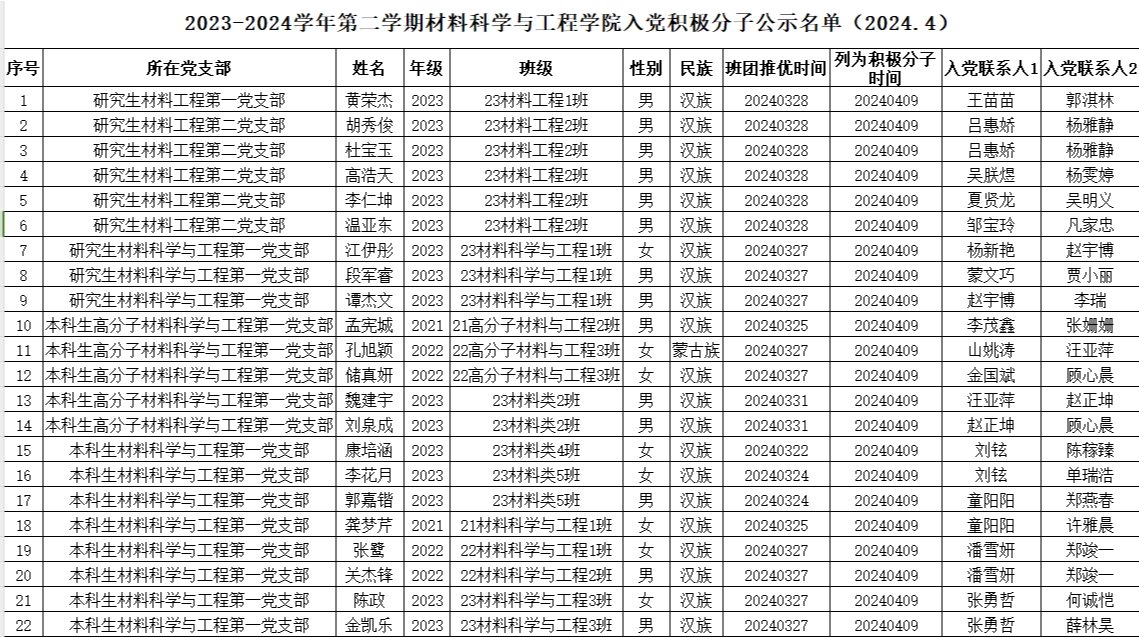 党建动态 当前位置: 厂长资源 > 党建思政 > 党建动态 > 正文 厂长资源 2024年4月入党积极分子名单公示 作者:时间:2024-04-09浏览次数: 各党支部、团支部: 经各团支部“推优”、厂长资源 团委审核以及各党支部委员会讨论研究决定,确定黄荣杰等22位同志为入党积极分子,现将名单公示如下: 公示时间:4月9日—4月11日,公示期内,凡对以上同志确定为入党积极分子有意见者,请及时以口头或书面的形式向厂长资源 党委或党支部反映问题。 联系电话:86845861,联系人:鲁宏浩。 E-mail:[email protected] ;办公室地址:24-404。 厂长资源 党委 2024年4月9日