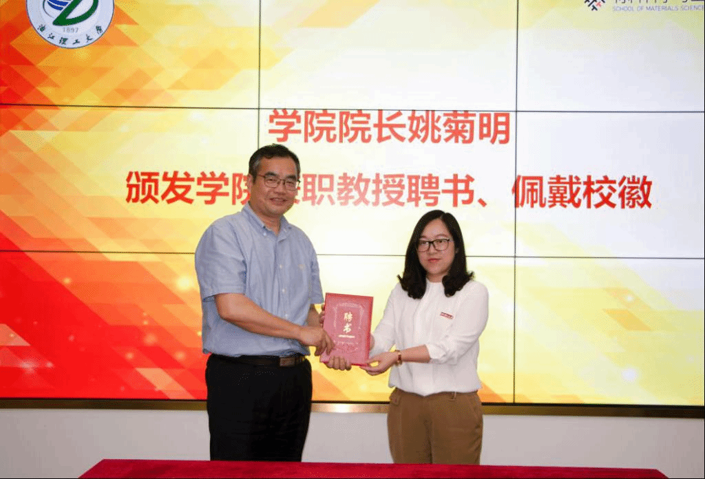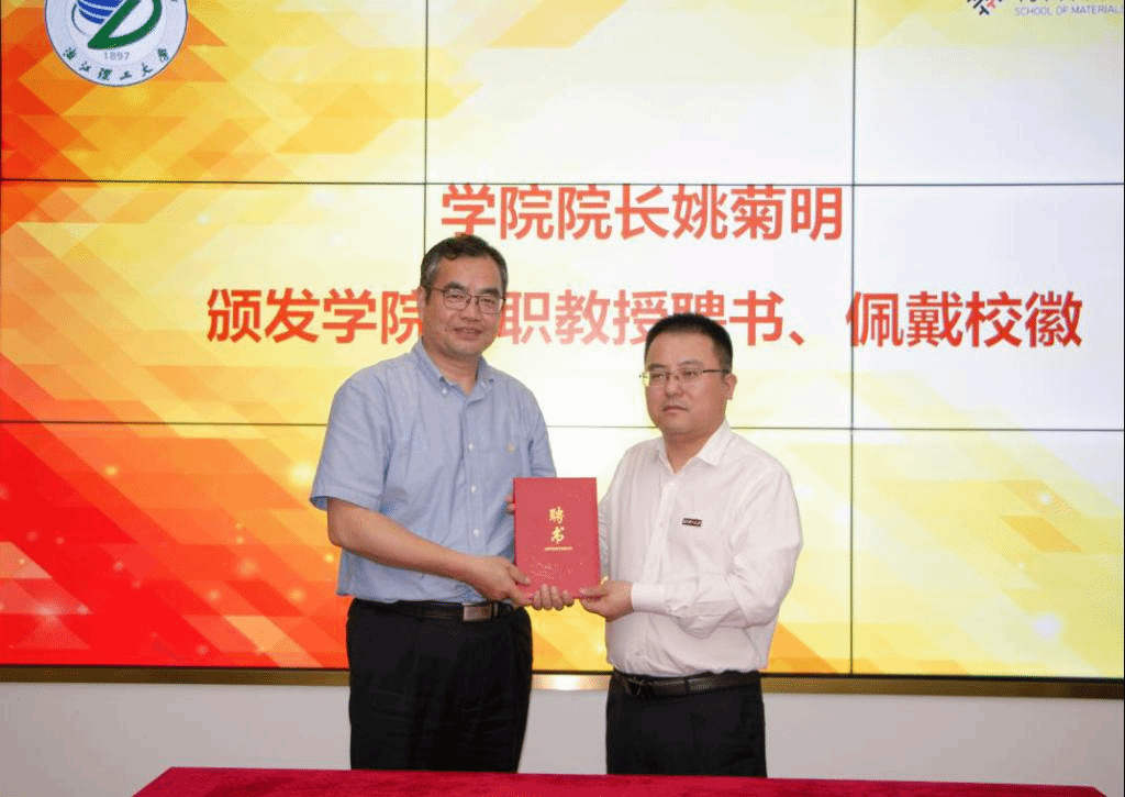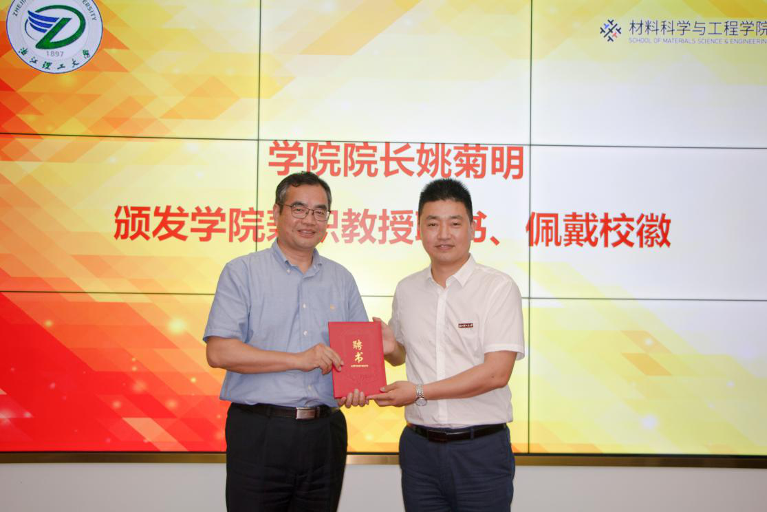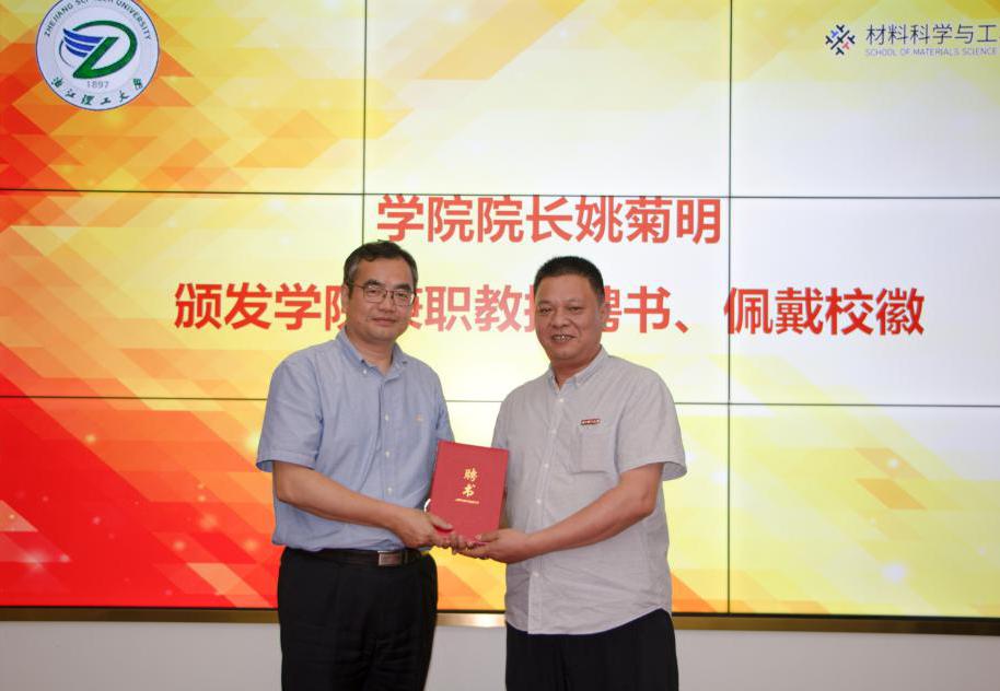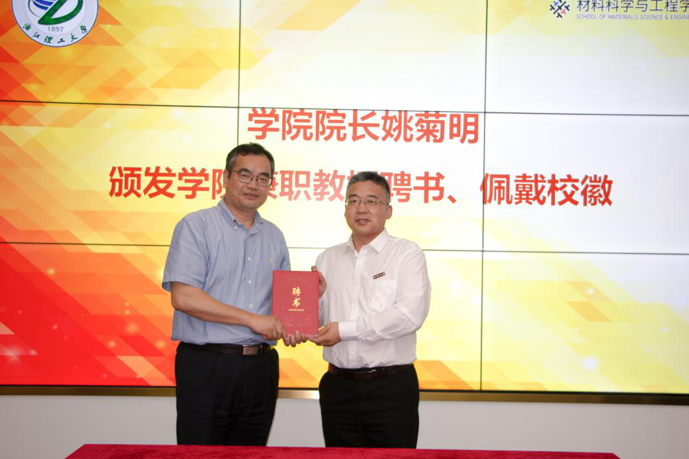 随后,副校长郜正荣为浙江联洋新材料股份有限公司董事长蔡正杰颁发兼职教授聘书并佩戴校徽。