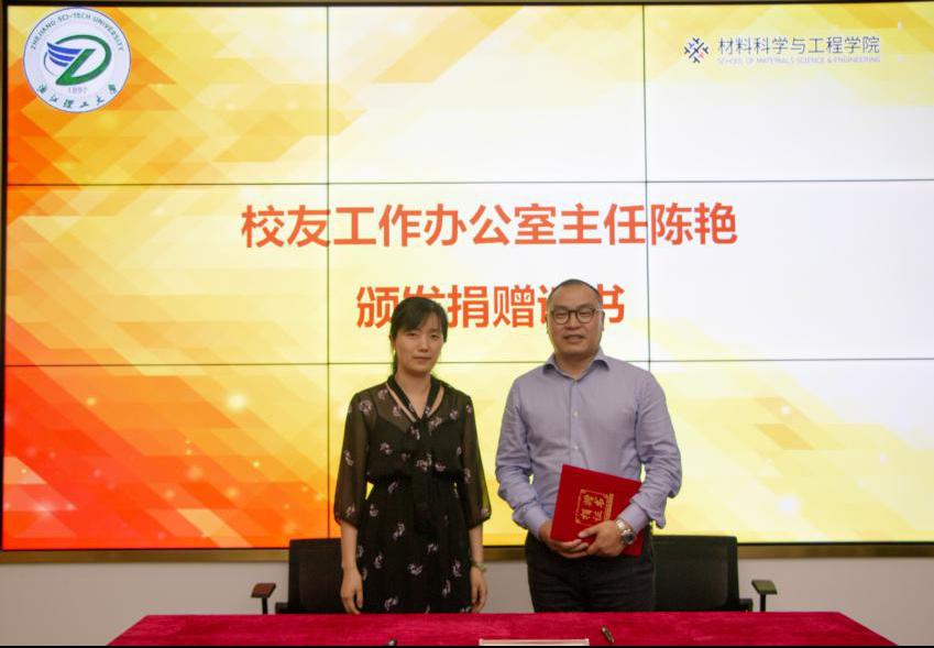 仪式上,校友工作办公室主任陈艳为浙江联洋新材料股份有限公司颁发捐赠证书。
