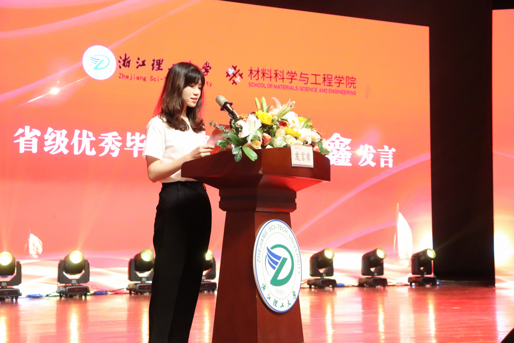 她简单回顾了本科四年的美好生活与取得的丰硕成果,表达了作为浙理学子需要在社会浪潮中传承浙理精神:践行 “大众创业,万众创新”的时代号召,为中国创新“加速度”贡献自身的一份力量;树立“终身学习”的理念,不断探索,自我更新,学以致用;不做“精致的利己主义者”。她也表达了最真挚的祝福:愿追梦之心常在,愿同学前程似锦、师长桃李满疆,愿母校“百尺竿头、更进一步”。