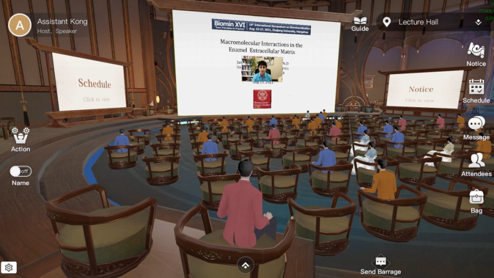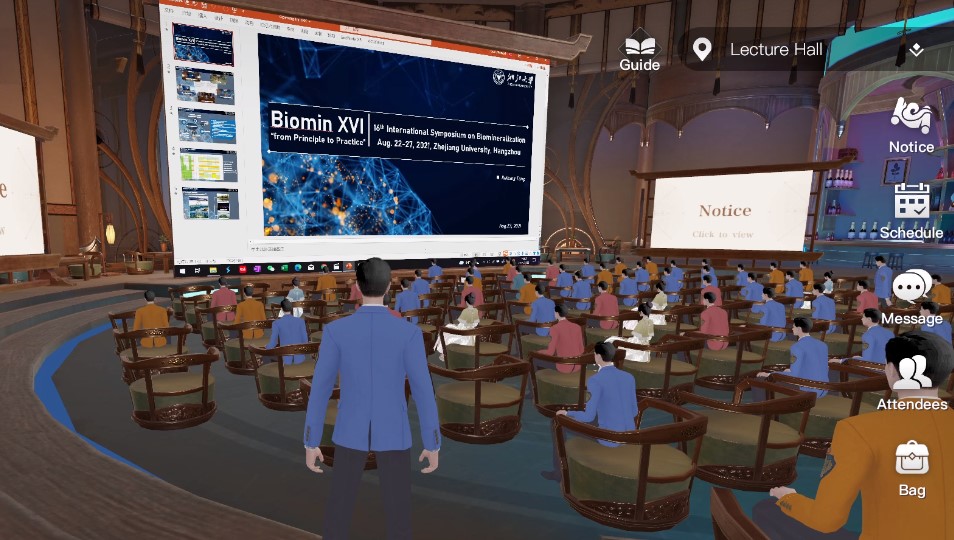 受COVID-19疫情影响,本次会议采用全程线上会议的形式,这给会议的成功举办带来了巨大挑战。会议举办方独辟蹊径,通过与网易伏羲实验室合作,特意打造了全新的“瑶台”沉浸式会议系统。为了让参会者有参加“真实会议”的体验,“瑶台”系统在网络中打造出虚拟会议场景(会议大厅、墙展厅、会客厅、峰会圆桌会议室以及茶室休闲区),让与会者在线上也有最真实的会议体验。本次会议共安排了16场主旨报告,11场特邀报告,35场口头报告,16场学生报告和35场墙展报告。会议还特意设置了生物矿化峰会环节,邀请国际知名生物矿化顶尖专家Peter Fratzl教授和Steve Weiner教授为主席,组织了由11名国际生物矿化顶尖专家组成的峰会团队,生动地介绍了生物矿化的研究历史、现状并一起探讨了未来发展的方向,使年轻学者更深入、更全面的理解生物矿化研究的丰富内涵。本次研讨会的组织安排和创新会议形式得到了与会者的普遍认可与高度赞赏。部分学者会后专门祝贺会议的圆满举办并称赞“瑶台”提供了全新的线上会议体验模式。