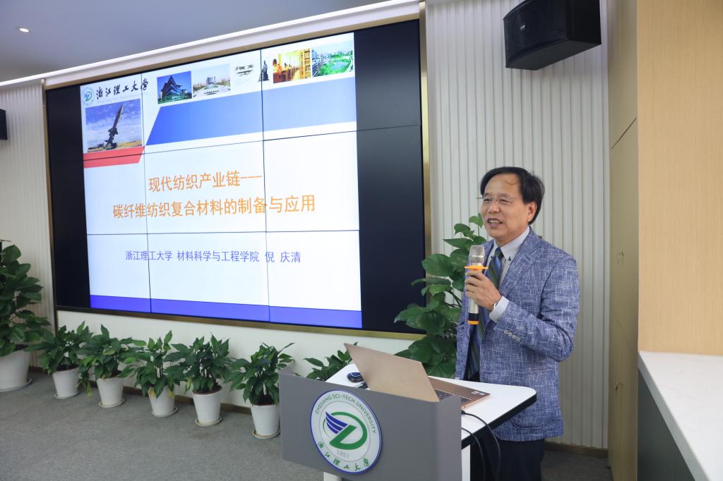 特聘教授倪庆清院士就碳纤维复合材料的制备和应用做学术报告。他在报告中提出在碳达峰、碳中和的时代环境要求下,轻量高强度纤维增强复合材料在航空、汽车、高铁等运输领域的应用会越来越广,这将给纤维、纺织产业带来新的机遇和挑战,项目组将与地方研究院合作积极推进纤维增强复合材料的研发、成形加工和产品中试一体化平台构建。