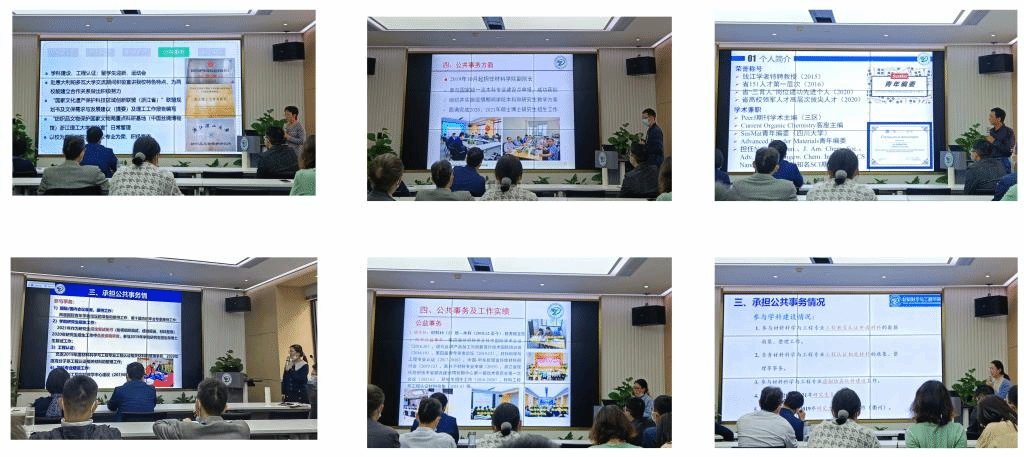 公共事务情况及自身工作实绩等方面进行了公开述职。在述职报告结束后,全体参会人员按照会议要求,对符合相关申报条件的十位教师进行了民主测评。最终,考核推荐组综合申报人员所在系(所)或部门、党支部推荐意见和民主测评结果,明确推荐意见。