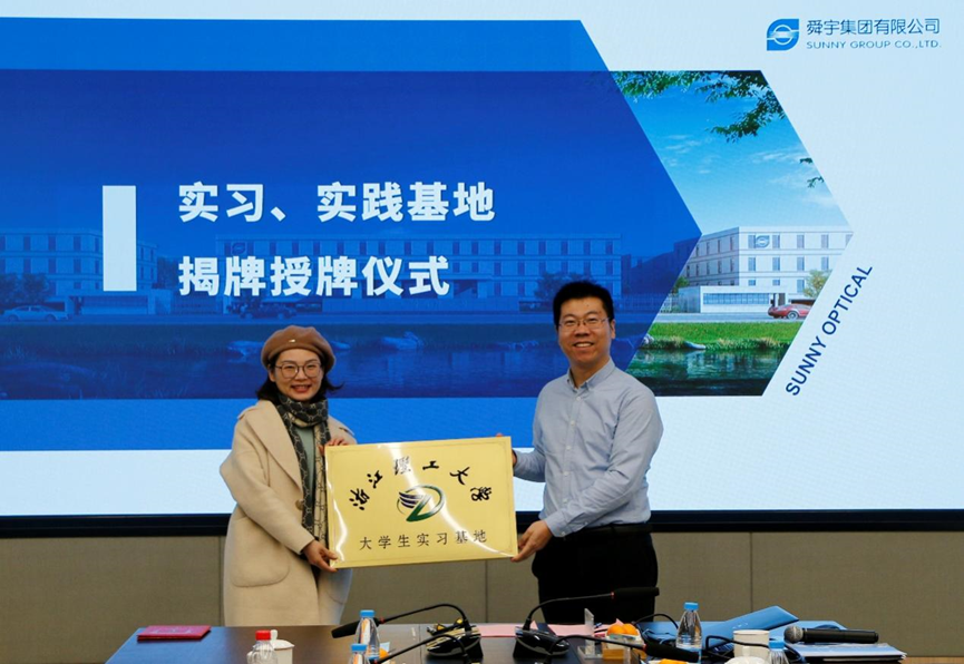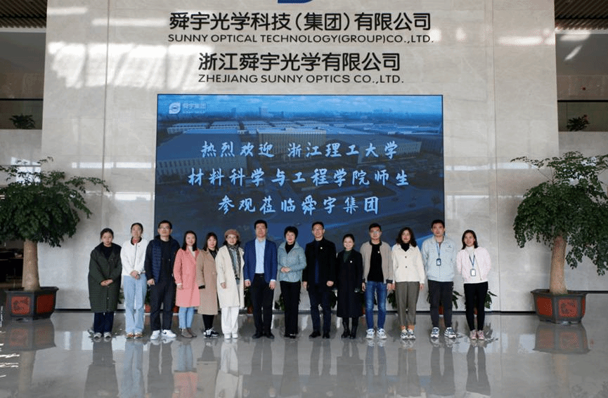 舜宇集团党委副书记诸杏珍、党群办主任助理陈红芬、人力资源部副部长焦树坤、招聘与配置课课长姜淑飘、车载光学项目质量BP二课副课长苏琪映(校友)、光学镀膜技术助理工程师刘东旭(校友)、招聘经理徐君、招聘经理梁潇文,厂长资源