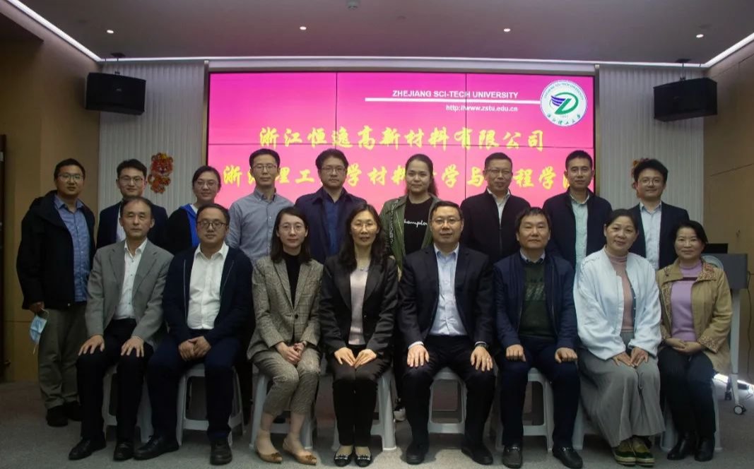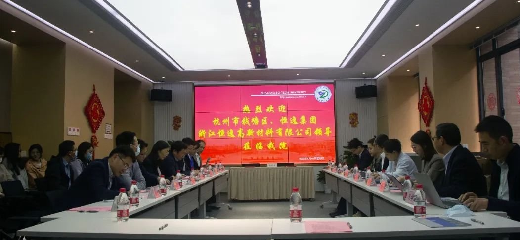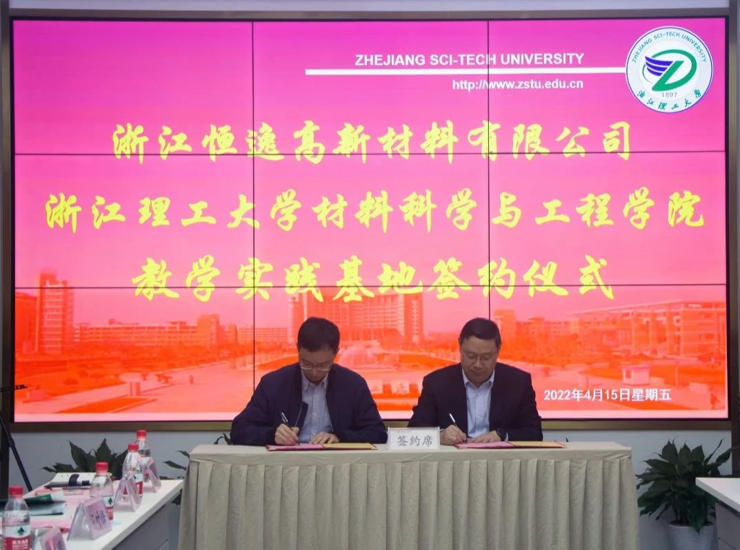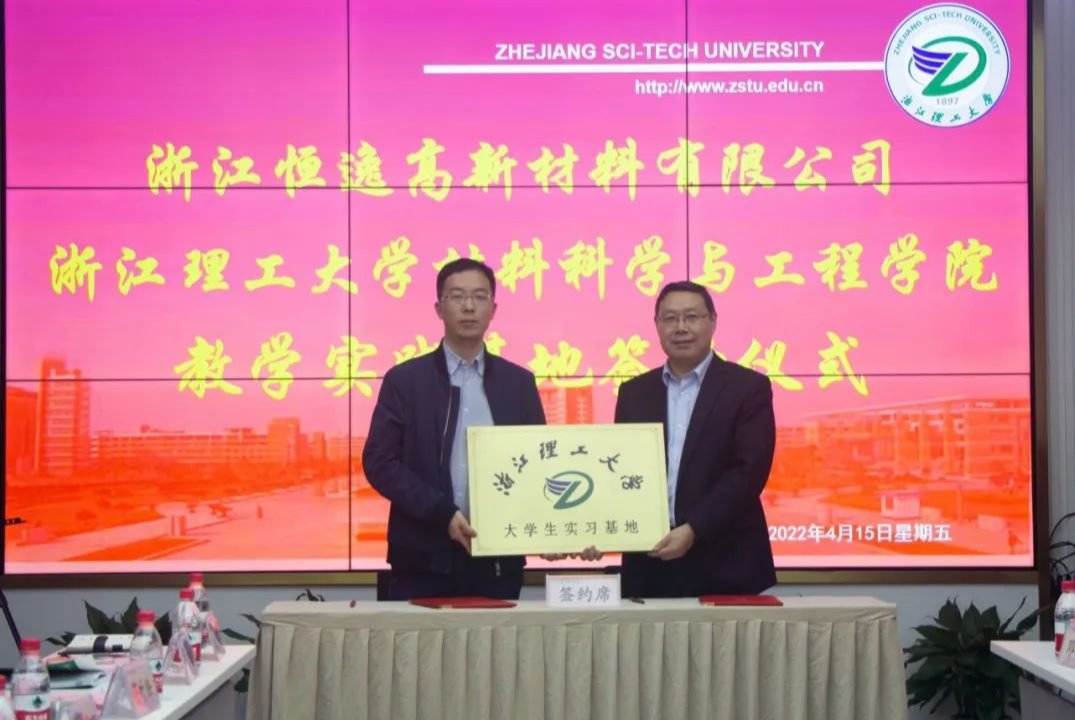 )与浙江恒逸高新材料有限公司联合举行大学生实习基地签约揭牌仪式。杭州市钱塘区人社局副局长范哲敏、工商联副主席应群颖, 人社局就业处主任周磊,恒逸集团人力资源部总经理薛丽莉、浙江恒逸高新材料有限公司总经理董庆奇及公司相关负责人,厂长资源
