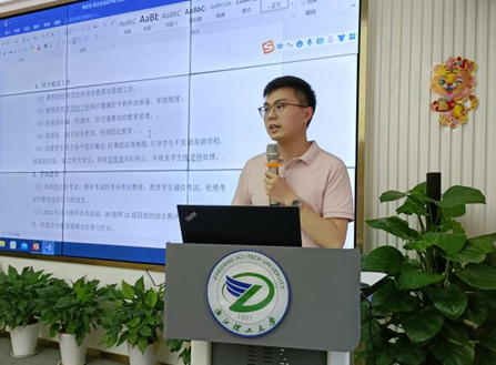 各带班辅导员针对近期的学生工作要点进行了汇报。毕业班辅导员张姗姗老师和魏厚钱老师就毕业典礼和文明离校教育等工作进行了讲解,并希望联合班主任力量高质量完成毕业生满意度调查工作,力争在调研质量上再上新台阶。张兴枝老师和鲁宏浩老师分别介绍了本科生和研究生近期将要开展的学风建设和心理健康教育相关工作,介绍了学校疫情防控的最新要求和暑假留校等事宜,提醒班主任在四六级考试、期末考试之前做好学生的诚信考试教育,把安全教育、校规校纪教育等落实在日常管理中。