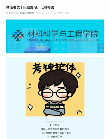 开展诚信考试倡议活动,通过线上推送进行宣传,呼吁广大材料学子以信复习,以诚考试。