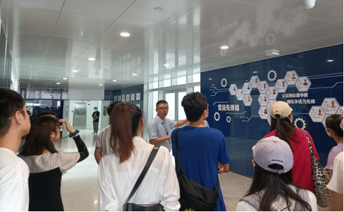 一行首先来到天通产业基地——天通瑞宏科技有限公司,参观了生产厂房,沈瞿欢向大家介绍了流片、压片制备工艺、企业生产情况和公司文化;曹佳辉校友现身说法,分享了个人在企业的成长经历,鼓励在场的同学们努力学习,刻苦钻研;董事长沈建松结合国家战略需求和自身创业经历,表达了企业攻克“卡脖子”技术的决心,也鼓励同学们增强专业认知,了解企业生产管理模式,提前树立成长目标。