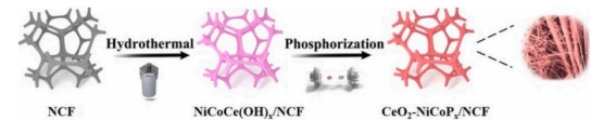 2022年6月,在Applied Catalysis B: Environmental杂志上发表了题为《Multiphase nanosheet-nanowire cerium oxide and nickel-cobalt phosphide for highly-efficient electrocatalytic overall water splitting》的文章,提出了一种新水热合成和低温磷酸化方法,在Ni-Co泡沫材料上原位设计了一种由氧化铈和磷化镍钴化合物(CeO2-NiCoPx)组成的杂化纳米线-纳米片结构作为裂解水的催化剂,在10 mA cm-2(j10)电流密度下,对HER和OER的过电位分别为39 mV和260 mV。 同时,CeO2-NiCoPx的纳米结构在100 mAcm-2(j100) 大电流密度下经长时间电催化(100h)测试后仍能保留。当CeO2-NiCoPx/NCF同时作为HER电极和OER电极时,可获得1.49V的电位,具有良好的耐久性。理论模拟和原位拉曼光谱表明,CeO2-NiCoPx/NCF催化剂中的Co原子和Ni原子可能分别作为HER和OER过程的关键反应中心。本研究为纳米级过渡金属化合物结构的多相和原位界面工程提供了一个新构建方案,不仅可以用于高效的全解水,而且还可以用于能源和环境应用的其他先进材料的开发。