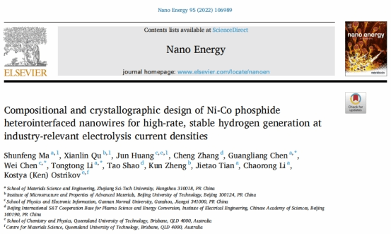 2022年2月在期刊Nano Energy发表一文题目为《Compositional and crystallographic design of Ni-Co phosphide heterointerfaced nanowires for high-rate, stable hydrogen generation at industry-relevant electrolysis current densities》。本工作通过合理的原子化设计,在Ni-Co泡沫合金(NCF)中靶向合成非常稳定的Ni5P4-Co2P纳米线析氢催化剂。纳米线芯主要由Co2P组成,纳米线外层由Co2P、Ni5P4和Co3O4组成。需要支出的是在CO2P和Ni5P4相中都获得了占主导地位的高指数(303)晶面,从根本上提高Ni-Co磷化物的催化活性。NCF表面形成的Ni5P4-Co2P纳米线阵列由于其独特的物理化学结构和合金效应,在碱性介质中表现出良好的HER活性和结构稳定性,其传递j1000的过电位仅为267 mV,超过了已报道的贵金属Pt/C、Pt/C/NCF等电催化剂。另外,Ni5P4-Co2P/NCF电极在j250的高电流密度下工作100h,仍具有较高催化活性,电催化可持续性强。本工作为在工业相关电流密度下合理设计高性能金属基析氢电催化剂提供了一种新的低成本、简单易行的方法。