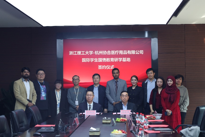 —杭州协合医疗用品有限公司国际学生国情教育研学基地签约仪式在浙江杭州举行。副校长郜正荣、杭州协合医疗用品有限公司总经理孙伟庆等参加签约仪式。