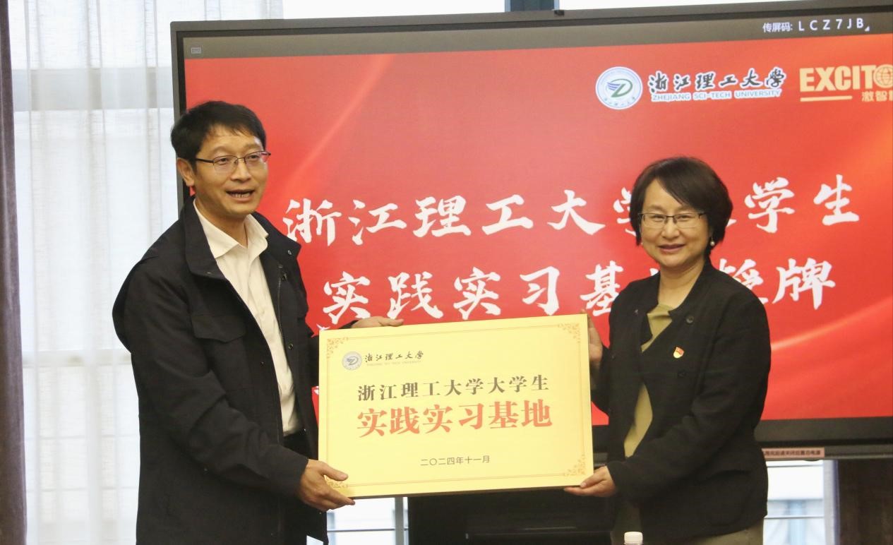 大学生实践实习基地授牌仪式,校党委副书记姚珺向宁波激智科技股份有限公司运营副总胡金福授牌。