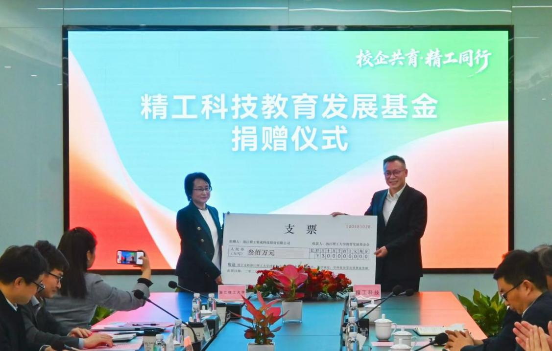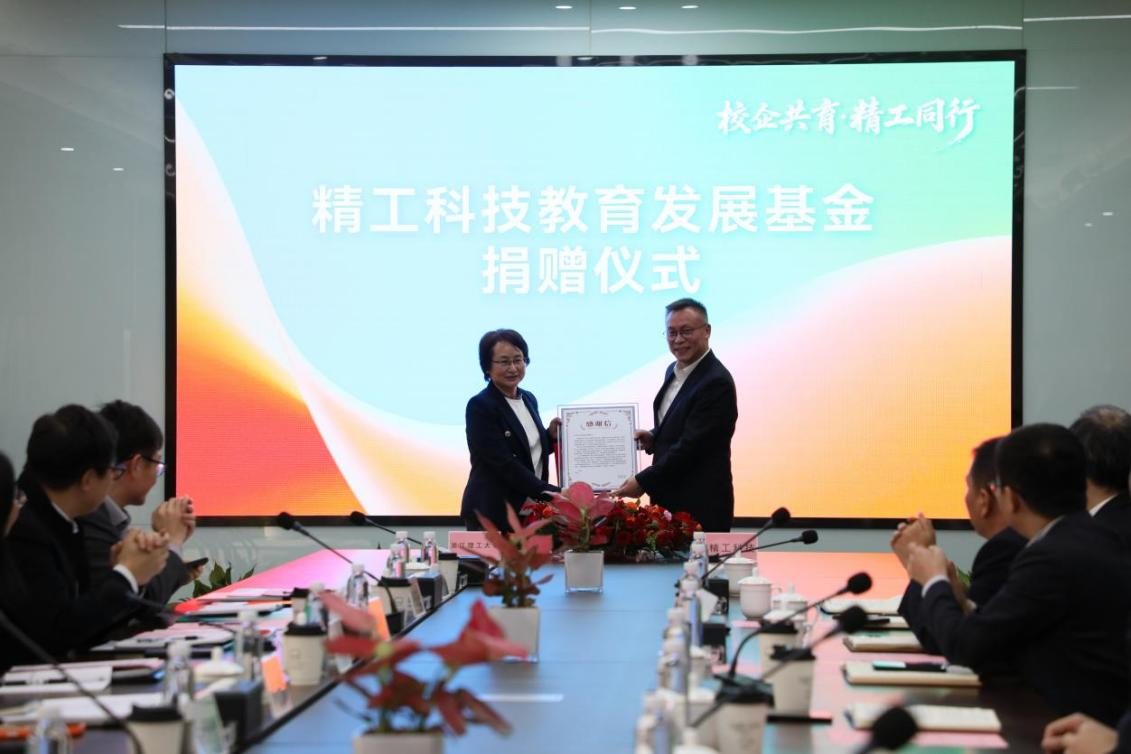 姚珺就精工科技对于学校教育事业发展给予的支持和关心表示衷心感谢。她基于校企双方合作交流的再深入、再拓展、再加强提出三点期望:一是以“党建筑基”共育时代新“才”。打破高校育人与企业用才壁垒,优化高层次人才联合培养方案;二是以“协同攻坚”聚焦课程、师资、平台核心,合力推进核心技术攻关与新材料产业升级;三是以“生态融通”构建教育科技人才一体化创新生态,为“创新浙江”注入动能。