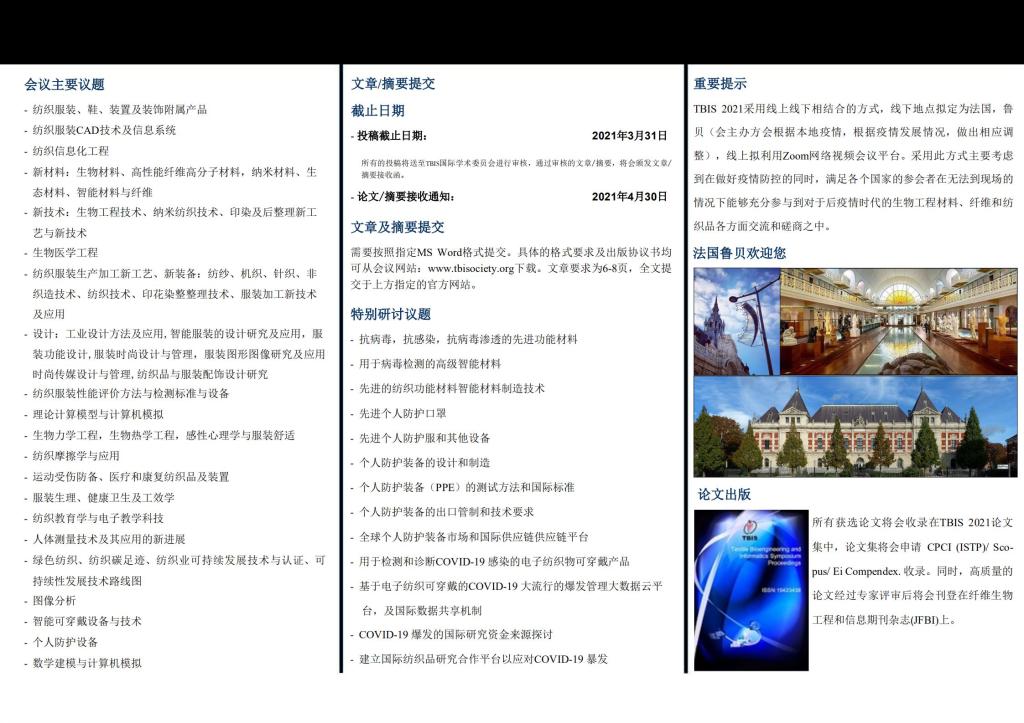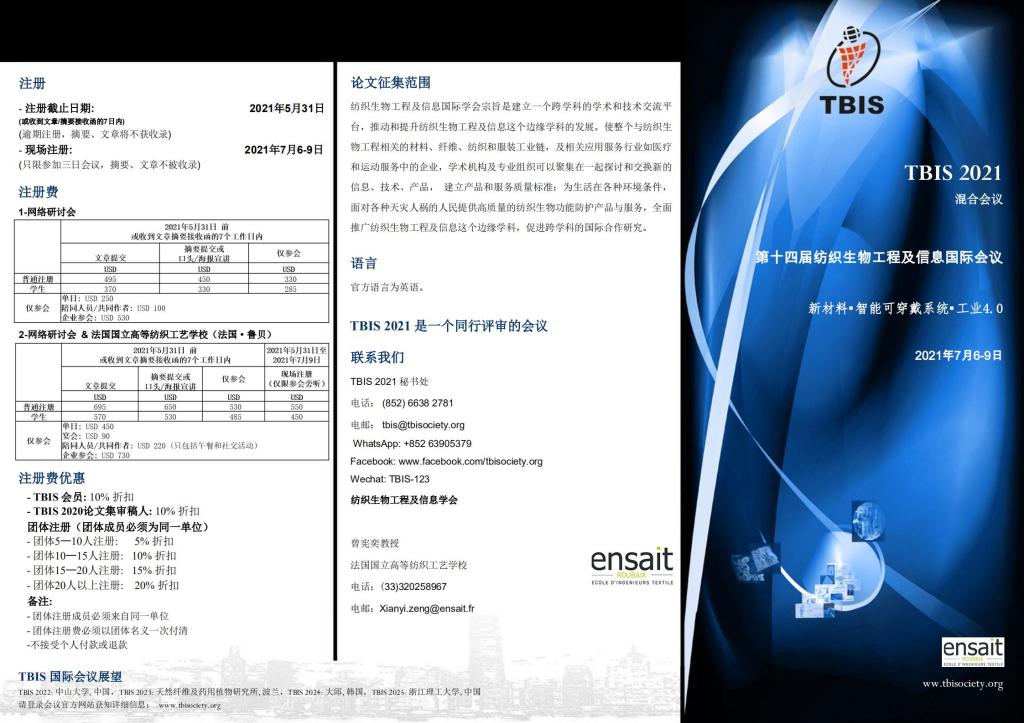 学术会议 当前位置: 厂长资源 > 学术会议 > 正文 TBIS 2021:第十四届纺织生物工程及信息国际会议 作者:时间:2020-11-19浏览次数: 附件【01-c-TBIS Brochure2021.pdf】已下载次 附件【01-Call for papers-abstracts-TBIS2021.pdf】已下载次 附件【01-e-English-TBIS Brochure2021.pdf】已下载次