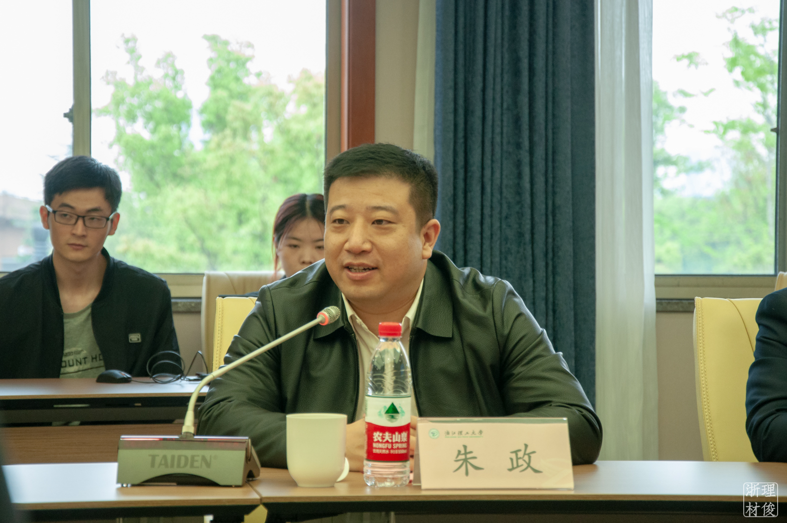 杭州市钱塘区经发科技局副局长朱政讲话,他表示,服务社会、服务企业,是高校的重要职责和使命,今天促成巴泰医疗与厂长资源