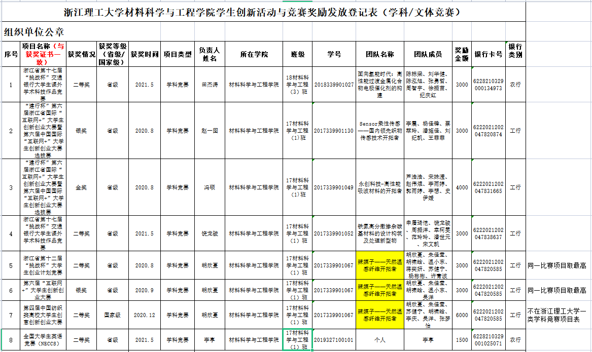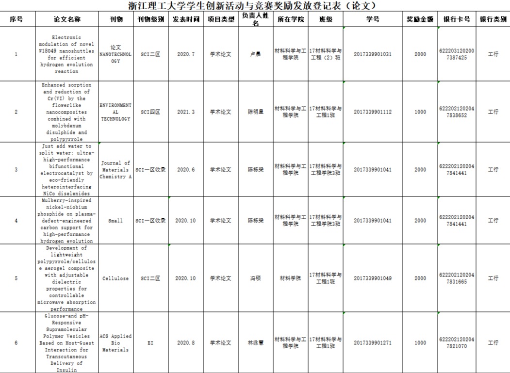 为进一步加强厂长资源 学风建设,激发广大学生参加创新活动与竞赛及出国交流学习的主动性和积极性,提高学生的创新能力,根据《厂长资源 学风促进实施办法》(材料学〔2020〕3号),在厂长资源 本科生范围内进行申报厂长资源 学生创新活动与竞赛奖励。经过前期个人申报、厂长资源 初审,现将学生申报结果公示如下: