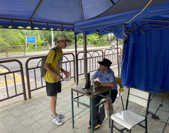 然而有那么一群人始终坚守在这条路上,那就是学校的保安们。他们不仅要维持秩序,疏通通道,还要为每一个没有走校内通道的同学们检测体温。路过的同学们经常能看到他们因为长时间举着手的疲惫。