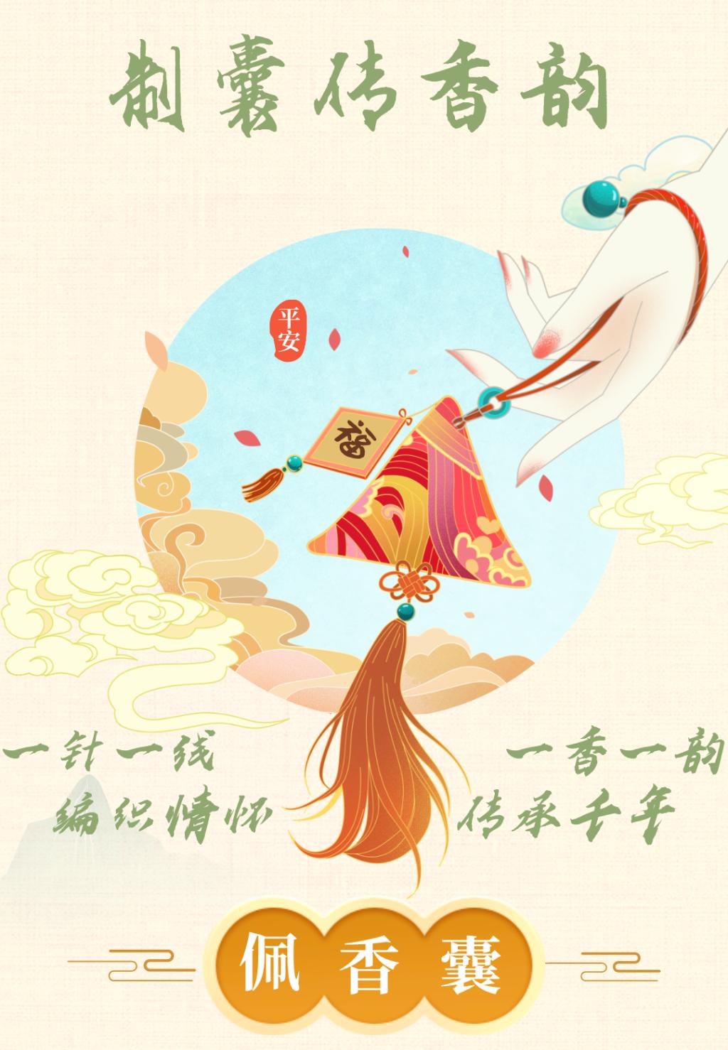 “蹙金妃子小花囊,销耗胸前结旧香。”香囊是我国传统手工艺品杰出之作,而今天,同学们自制香囊,传达这份浓郁的情感。