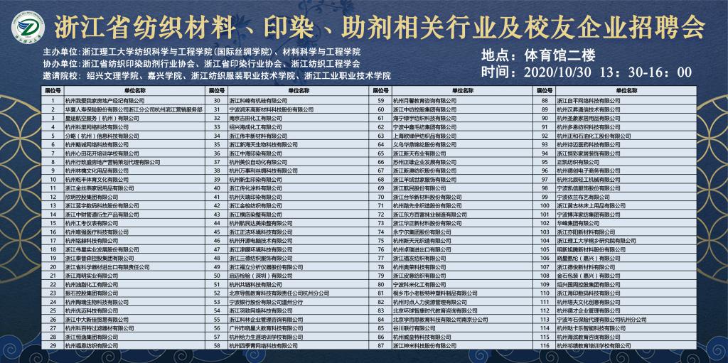 您好!欢迎报名参加“2020年浙江省纺织材料、印染、助剂相关行业及校友企业招聘会”,您的展位号见下图:
