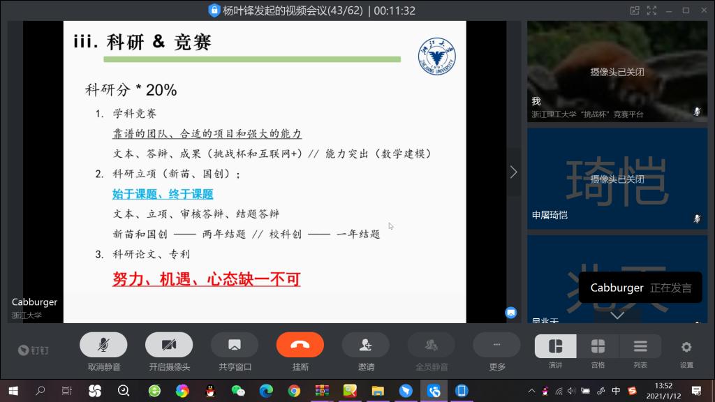 随后,推免至浙江大学化学系的蔡浩然同学进行了自己的保研经验分享,他从保研条件出发,通过名额和offer两个主题进行了详尽讲述,建议同学们仔细了解当年的保研名额分配,针对自身情况进行评估,综合分析自身的保研几率;同时分享了他获取高绩点、高科研分的方法,并为大家详细地讲述了夏令营/预推免的详细流程及相关注意事项。最后,他引用供求关系这一概念给予大家除保研外的其他选择和真挚的祝福寄语。