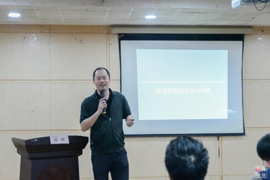——“学校的朋友圈怎么发”。本次讲座题为教育新闻的发现与把握,在徐晖老师生动有趣的讲解下,全体同学对新闻宣传等方面有了更为深入的了解与认知。在自由提问环节,同学们积极地向徐晖老师进行提问,老师仔细地为同学们解答相关问题,大家都收获良多。