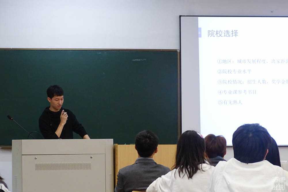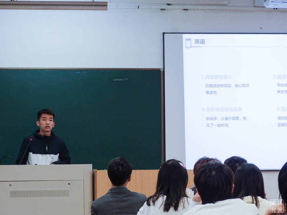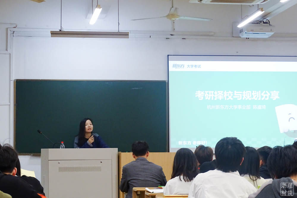 拟聘请研究生党员为2018级考研学子进行“1+1”结对,为大家提供指导与服务,并且督促鼓舞引导每一位考研材俊, “考研过程中你不是一个人在战斗”,研究生党员代表章睿同学进行发言,章睿表示,作为一个过来人,自己也回忆起考研充实难忘的经历,希望能给大家的考研之路出一份力。最后,新东方进行了一场公益讲座,由杭州新东方大学事业部考研英语老师为大家带来考研择校与规划分享。