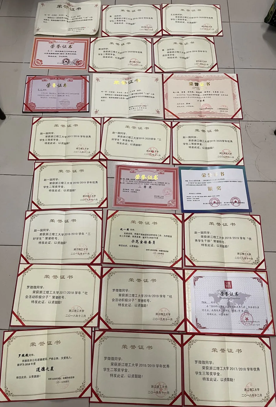 曾多次获得优秀学生三等奖学金、二等奖学金、浙江省政府奖学金、 “三好学生”、“优秀学生干部”荣誉称号;校优秀毕业生;校级“互联网+”大学生创新创业大赛一等奖、 校级“创青春”大赛二等奖、浙江省国际“互联网+”大学生创新创业大赛银奖、全国纺织类高校三创大赛二等奖等。
